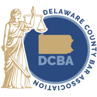 Logo of the Delaware County Bar Association featuring a gold statue of Lady Justice holding scales, with a blue circular background and the organization's initials DCBA.